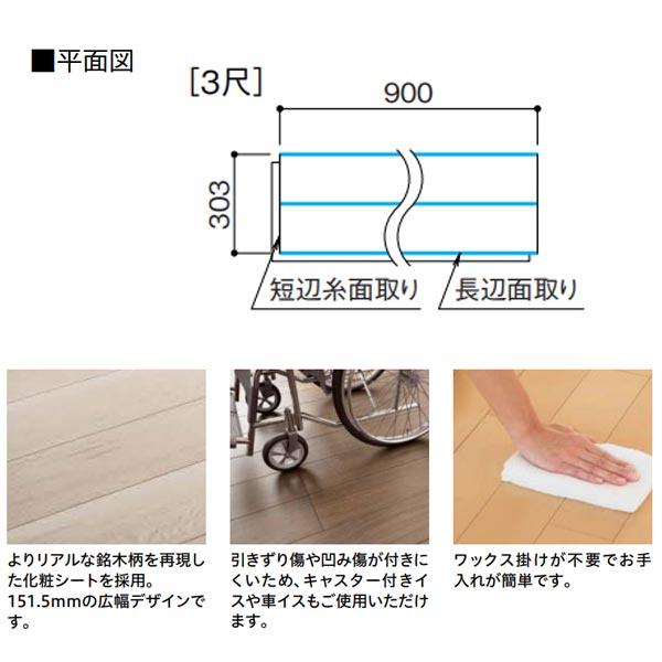 仕上げ材が一体になった温水式床暖房光沢を抑え、銘木の持つ意匠の美しさを再現したシート化粧の温水式床暖房です。家族の集うリビングにおすすめです。よりリアルな銘木柄を再現した化粧シートを採用。151.5mmの広幅デザインです。引きずり傷や凹み傷が付きにくいため、キャスター付きイスや車イスもご使用いただけます。ワックス掛けが不要でお手入れが簡単です。注意事項等、良くご確認くださいますようお願い致します。サイズ:12mm厚さ、303×900mm梱包・入数:6枚入り基材:Wハードベース付合板表面:特殊オレフィンシート※受注から工場出荷まで約7日。"} ■ワックスは必要ありません。