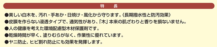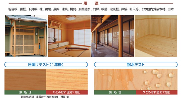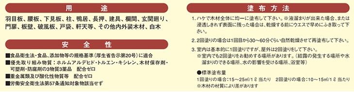 ◆用途◆羽目板、腰板、下見板、柱、鴨居、長押、建具、欄間、玄関廻り、門扉、板壁、破風板、戸袋、軒天等、その他内外装木材、白木◆(社) 日本塗料工業会登録 登録番号:K18001 ホルムアルデヒド放散等級:F☆☆☆☆●送料本州宛て:無料北海道、沖縄、離島に関しては別途送料が発生いたします。ご注文確定画面には表示されませんが、注文承諾メールにて改めて正確な送料をご連絡させて頂きますのでご了承ください。"}