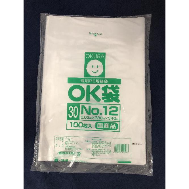 大倉工業OK袋12号(規格品)0.03X230X340mm1箱:100枚入X10袋X5箱"} 名 称 OK袋12号 サイズ 230X340mm 厚 さ 0.03mm 色 透明 材 質 LDPE※ 入 数 5,000枚 内 容 100枚入×50袋 製造元 大倉工業(株)