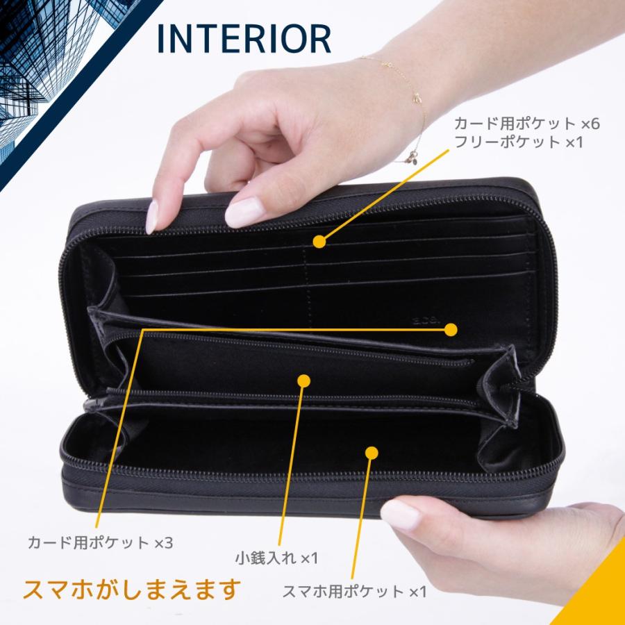 【仕様】小銭入れ(ファスナー開閉)×1、カード9枚収納可能、フリーポケット×1、スマホ用ポケット×1
