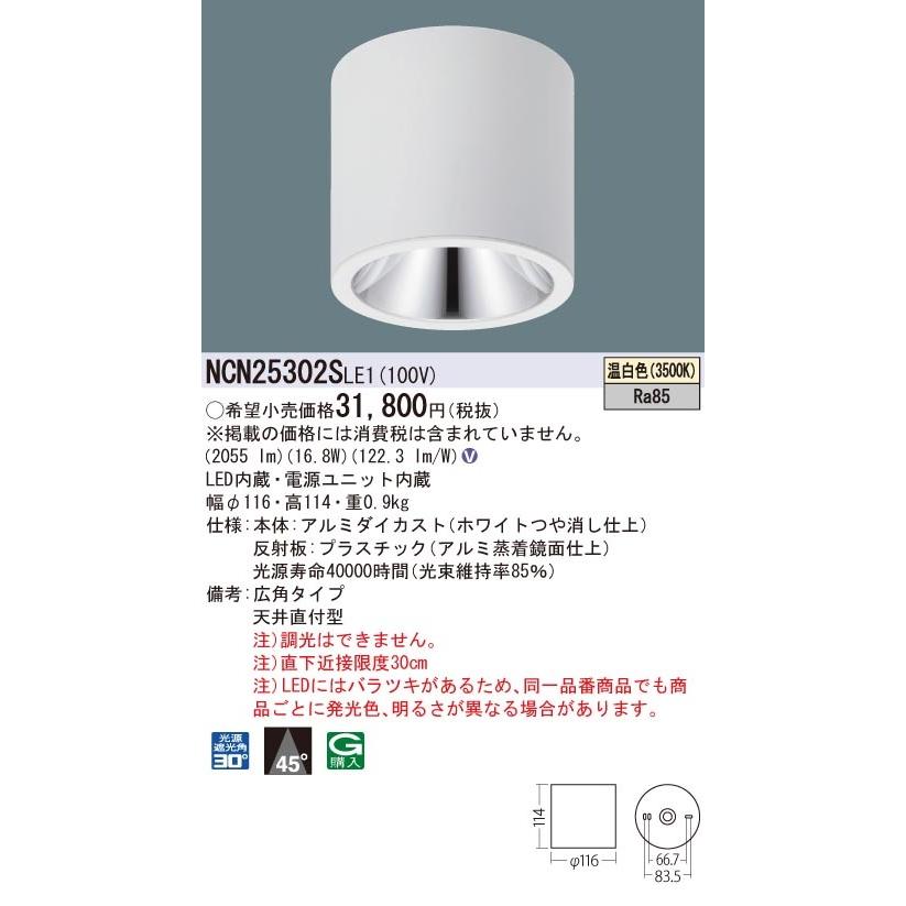 【法人様限定商品】パナソニック NCN25302SLE1 LED小型シーリングライト 天井直付型 ビーム角45度 広角 温白色