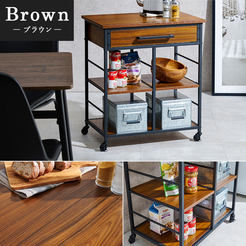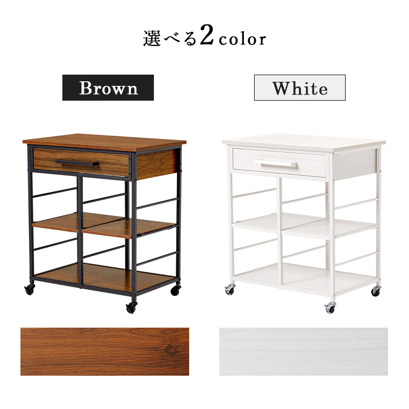 作業スペースや補助テーブルとしても快適な広々天板のキッチンワゴン。カトラリーなどを収納できる引出付き。■サイズ: (約)幅60×奥行40(取っ手含む42.5)×高さ70cm■素材: フレーム:スチール天板:合成樹脂化粧繊維板(メラミン樹脂)■生産地: 中国製■その他:・組立式・キャスター付・可動棚×2枚