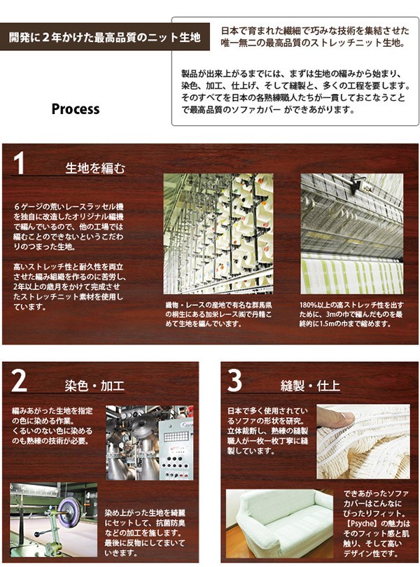 【内容】psyche(プシュケ)とは、ギリシャ神話の中で人間から神になる女神のことです。のちにギリシャ語で、サナギから美しく変容する「蝶」や、変化していく「心」を意味するようになりました。純国内生産にこだわり、本物のクオリティを追求したソファカバーです。ポリエステル素材がほとんどの従来人のソファカバーに対して、コットン比率を大幅にアップすることで抜群の肌触りと吸湿性を実現しました。またいつでも快適にご愛用していただけるようにも施してあります。高いストレッチ性で多くのソファにぴったりとフィットします。お手持ちのソファの汚れ防止はもちろん、時期に合わせたドレスアップとしても、是非ご活用ください。新開発素材を採用しています。収縮率180%の贅沢なストレッチ素材を使用。綿を76%配合した極上の肌触りと抜群の吸湿性で熱のこもりやすいウレタンや化繊、合成皮革等のソファに最適です。●素材綿76% ポリエステル17% ポリウレタン7%●機能(SEKマーク取得)・ウォッシャブル<対応ソファサイズ>肘無3人掛け用)巾140cm〜200cm/高さ〜90cm/奥行80cm〜90cm"}