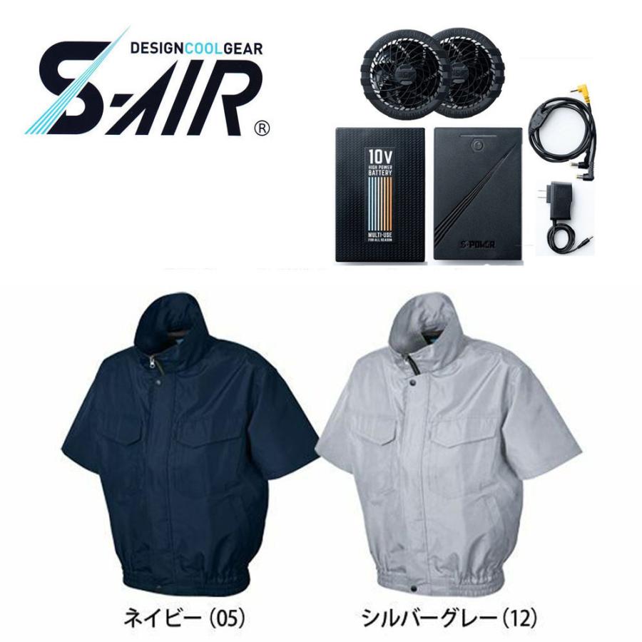 ☆空調ウェアとは腰の部分に付いている2つの小型の扇風機により、衣服の中へ空気を取り込み、自然発汗した汗を気化させ、体温と湿度を調整するという商品です。☆商品の内容は半袖ブルゾンとファン(×2個)、10ボルトバッテリー、充電用アダプター、ファン用二股コードです。フルセットなので、すぐにご使用いただけます。☆一番強い「強」使用時で約8時間の動作が可能です。☆ポリエステル100%の高密度コーティング素材となっております。☆首周りの冷感をアップする高めの立ち襟仕様となっております。☆両胸、両脇にポケットが付いております。☆作業性、ポケット収納力も高く、あらゆる作業に対応する仕様となっております。☆送料無料、手数料無料となります。素材・色・サイズ【素材】ポリエステル100%(風抜け防止コーティング)【色】05ネイビー 12シルバーグレー【サイズ】4L~7L【バッテリー性能】●外形寸法:72mm×108mm×23mm●質量:240g●容量:DC7.26V/6400mAh/46.46wh●出力:強 10V / 中 9V / 弱 8V / 最弱 7V●連続稼働時間:強 約8時間 / 中 約9.5時間 / 弱 約11時間 / 最弱 約13.5時間●充電時間:6.5〜7時間"} S-AIR 空調ウェア 半袖ワークブルゾンタイプ ファン、バッテリーフルセット(88110+SA-10-b)