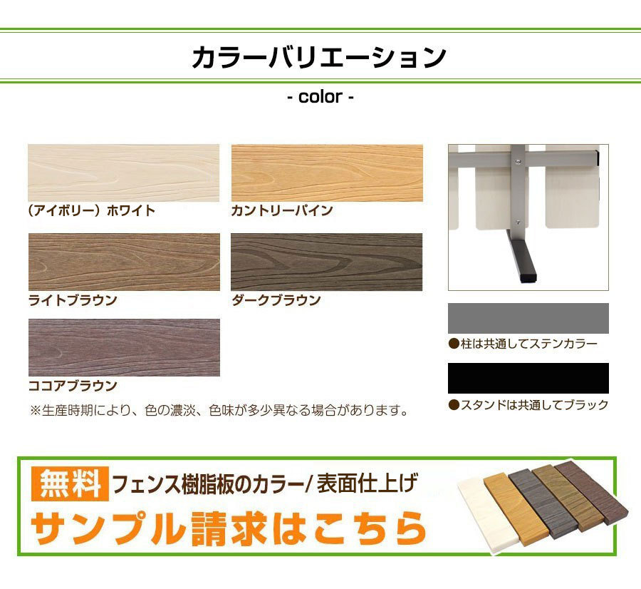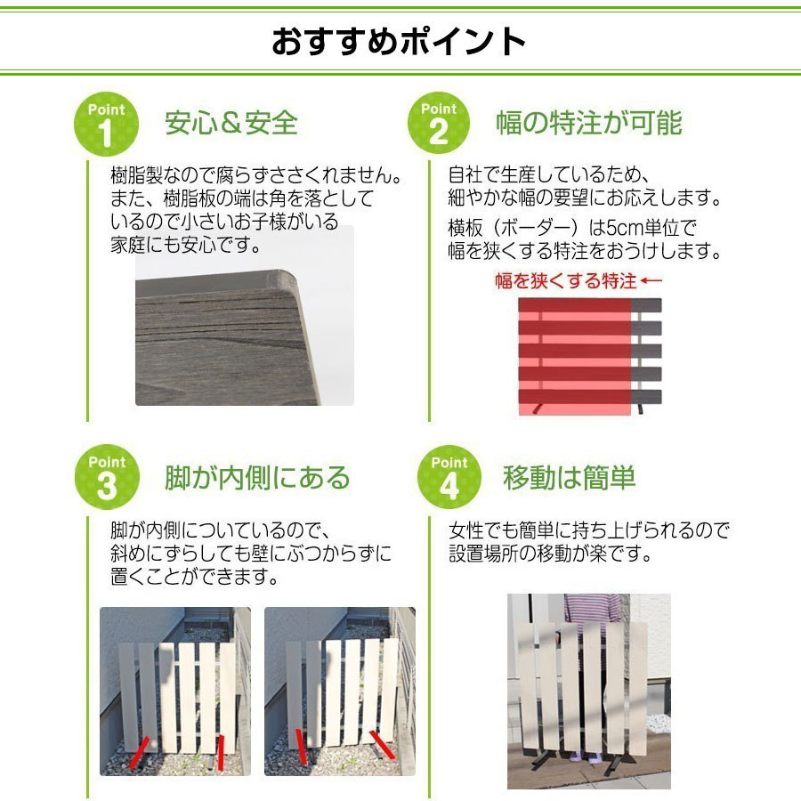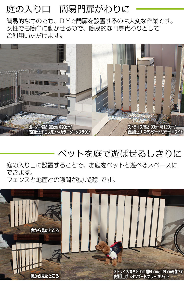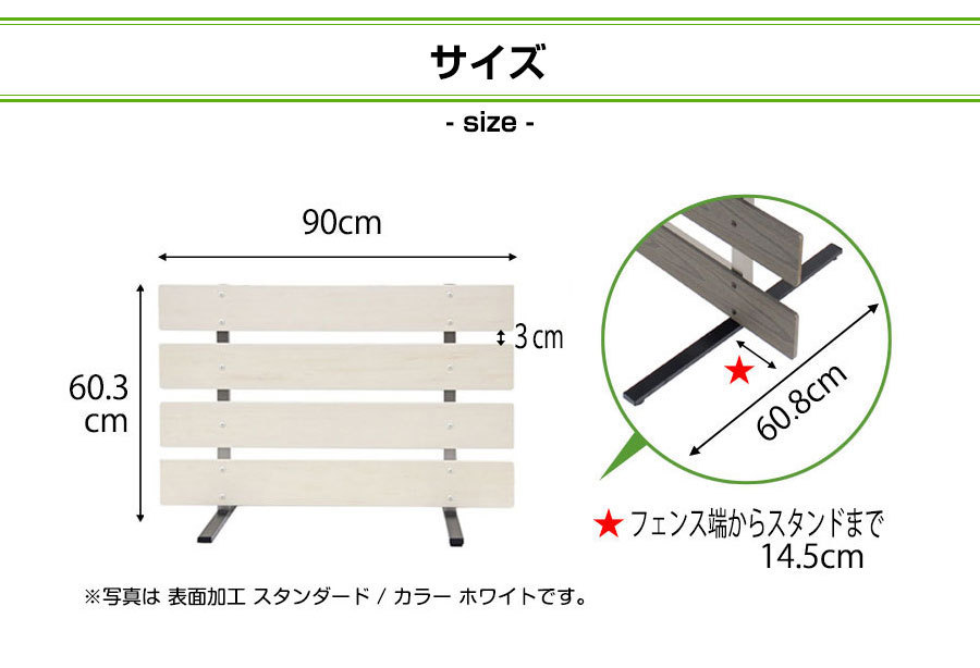 【商品名】スタンド式フェンス ボーダー エレガント【サイズ】高さ60.3cm 幅90cm 奥行60.8cm 板間隔3cm【重量】約5.6g【カラー】(アイボリー)ホワイト、カントリーパイン、ダークブラウン、ライトブラウン、ココアブラウン※スタンドは全色共通でブラック【材質】樹脂、アルミ、スタンドはスチール【お届け状態】フェンスは完成品でお届け、スタンドのみ取付作業があります【送料】北海道・沖縄県・離島は別途送料を頂戴いたします。ご注文後にご案内いたします。【特注】幅60cm〜85cmまで5cm単位で承っております。追加料金2000円頂戴いたします。【使用上の注意】転倒防止の為、スタンド部分に重しをしてのご使用をお勧めいたします。強風時は一時的に安全な場所に移動してください。"}