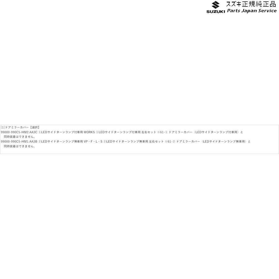 ■製品品番・99000-990C5-HM2 or 99000-990C5-HM1■対応車種メーカー車名:スズキ アルト型式:HA36S(3型)年式:2020年12月〜※グレード・仕様要確認■商品構成[1]ドアミラーカバー【選択】99000-990C5-HM2:AA3C (1)LEDサイドターンランプ付車用 WORKS (1)LEDサイドターンランプ付車用 左右セット ※61-(1) ドアミラーカバー(LEDサイドターンランプ付車用)と 同時装着はできません。99000-990C5-HM1:AA3B (2)LEDサイドターンランプ無車用 VP・F・L・S (2)LEDサイドターンランプ無車用 左右セット ※61-(2) ドアミラーカバー(LEDサイドターンランプ無車用)と 同時装着はできません。■材質/特徴樹脂クロームメッキ■注意事項*適合情報はメーカーの最新公式カタログをご確認ください。ご不明な場合はお調べて致します。*取付車両の仕様によっては取り付けができない場合がございます。*商…※詳細はPC用説明文をご確認下さい"}
