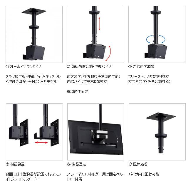 オールインワンタイプの天吊金具■質量:約3.5kg■総耐荷重:20kg (※取付ディスプレイ:15kg以下)■外形寸法:幅 180 × 奥行き 180 (mm)■付属品:ディスプレイ取付ネジ、化粧カバー、固定ベルト1本、結束バンド3本■備考:取付ピッチ75×75mm100×100mm上下調節:50mmピッチ 4段階角度調節:前方20度、後方4度、左右各70度(任意調節可能)スラブ面からテレビ画面センターまで、400 / 450 / 500 / 550mmの上下調節可能化粧カバーはスラブ面から天井面まで最大190mmまで対応※取付けに際しての注意事項スラブの剛性を十分に考慮の上、取付け位置を決めてくださいスラブへの取付用ネジは同梱されていませんスラブへの取付けは取付工事専門業者にご依頼ください※テレビ背面形状や端子位置によって、一部取付けできない機種があります。※取り付けるテレビの対応状況をWebサイト「テレビ取付対応検索」にて事前にご確認ください。※記載は商品仕様の一部です。仕様説明不足等の理由での返品はできません。特に適合等は必ずご確認ください。