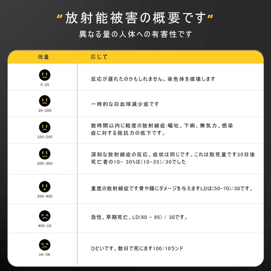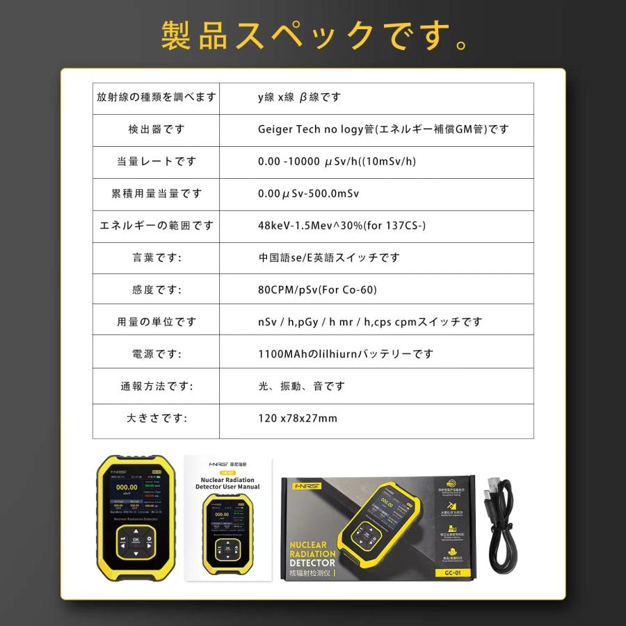 商品情報商品名:放射線測定器 ガイガーカウンター 高精度 β線/γ線/X線測定 警報機能 エネルギー補償型GMチューブ 核放射能 デジタルLCDスクサイズ:120*78*27mm重量 : 244 g【1】この検出器はX線、γ線、β線の測定に使用され、放射線レベルのわずかな変化を測定するのに最適なもので、一般的に使用されているほとんどの核種に対して高い感度を有しています。【2】多機能モニタリングページ、現在の線量率リアルタイム値、累積測定値、累積保存線量率、最大値、平均値、開始日、累積時間をリアルタイムで表示するLCDカラー画面を構成しました。【3】家族の装飾、放射線輝く製造企業、衛生、放射線治療、核実験室、原子力発電所、輸出入商業検査、建築材料、石油化学、地質一般調査、使用鋼鉄、業界の欠陥検出などに適した広※梱包時のサイズとなります。商品自体のサイズではございませんのでご注意ください。放射線測定器 ガイガーカウンター 高精度 水測定 充電式 高感度 β線/γ線/X線測定 警報機能 核放射線検出器 コンパクト 警報器 2023"}