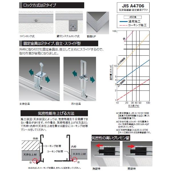 特徴気密性の高いグレモン錠、目違いや段差が生じにくい。不快な冷気・隙間風をシャットアウトする。省エネ住宅・クリーンルーム・病院・ホテルでの使用に最適な点検口です。自立・スライド型の新設計。外枠に取り付けた固定金具は、自立して左右にスライドするので、取付作業が容易になりました。内枠に取り付けた発砲ゴム(EPDM)とグレモン錠により、気密性を高めました。内枠と外枠の接合部には、スライド式多軸ヒンジを採用。開口スペースがより広くなり、点検作業がより快適になりました。仕様アルミ製アルマイト処理室内用カラー:シルバーサイズ:300角仕様:支持金具/鍵付システムロック式材質枠:アルミ押出し材(アルマイト仕上げ)※商品イメージはKM451の物を使用しております。"} 気密性の高いグレモン錠、目違いや段差が生じにくい。