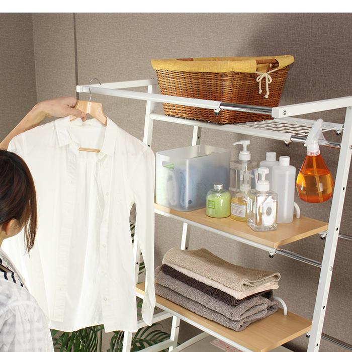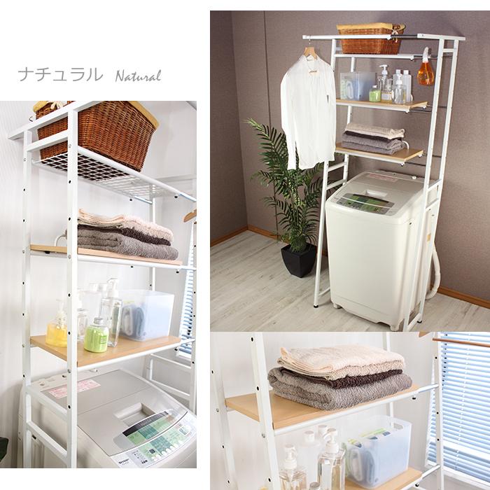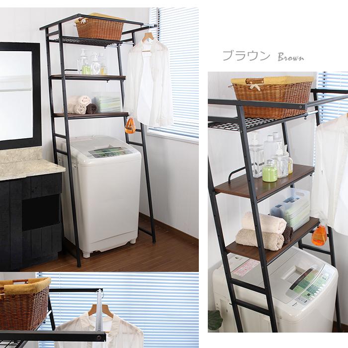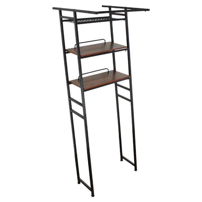 ランドリーラック 伸縮 立掛け式 ハンガーバー付き ランドリー収納 洗濯機ラック 洗濯機上収納 洗面所 脱衣所 ブラウン EKT-1896BR