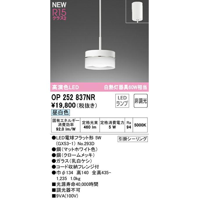 【決済・後払い決済】 高演色LED 白熱灯器具60W相当 OP252837NR 昼白色 消費電力5W Ra94 ●LED電球フラット形 5W(GX53-1) No.293D ●(マットホワイト色)●鋼(クロームメッキ)●ガラス(乳白ケシ) ●コード収納フレンジ付 ●巾φ134 高140 全高435-1,235 1.0kg ■光源寿命40,000時間 ■調光器 引掛シ-リング その他メーカーへのお問い合わせはコチラ →