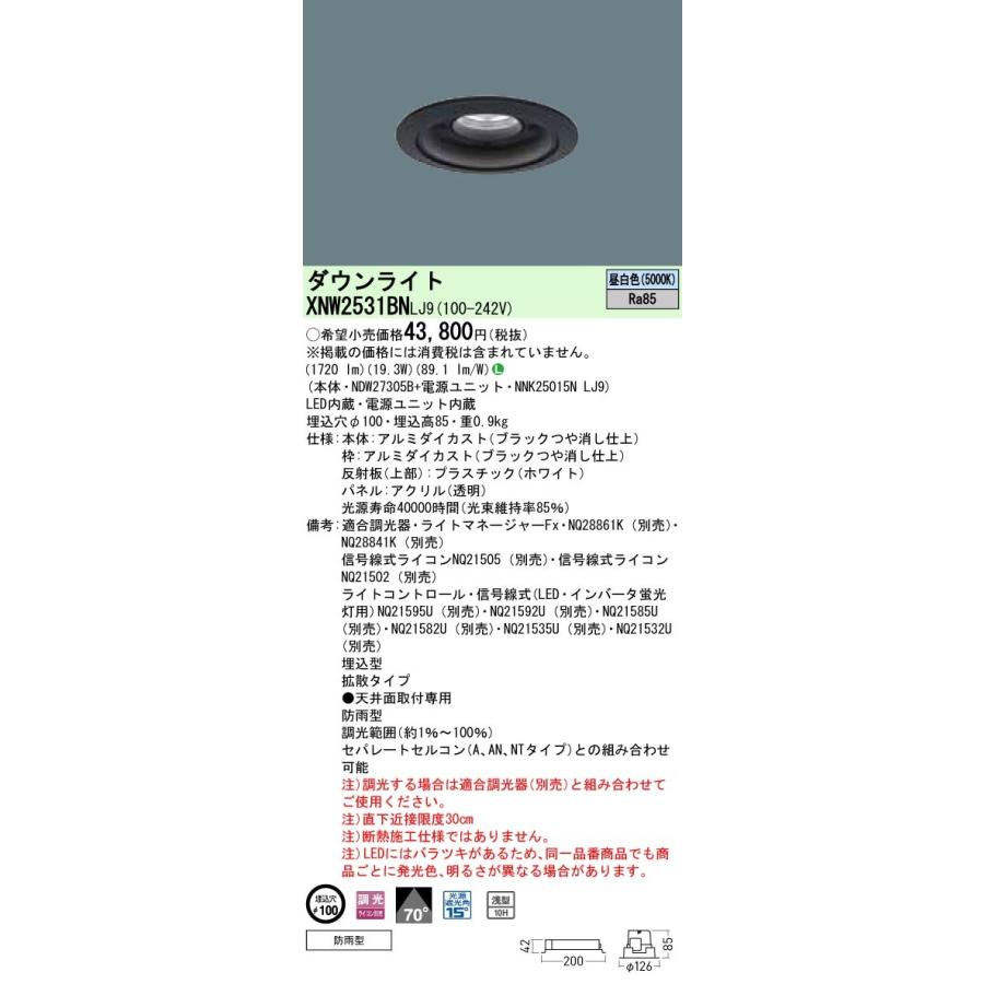 パナソニック XNW2531BN LJ9 LED 昼白色 ダウンライト 浅型10H ビーム角70度 防雨型 調光型 埋込穴φ100 水銀灯100形1灯相当 本体+電源ユニット