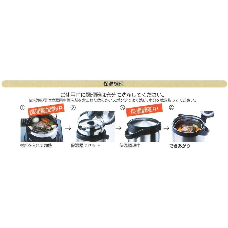 - 素材・材質:調理器=ステンレス鋼(クロム18% ニッケル8% 鉄74%)アルミニウム シリコーンゴム 保温器=ステンレス鋼 ポリプロピレン