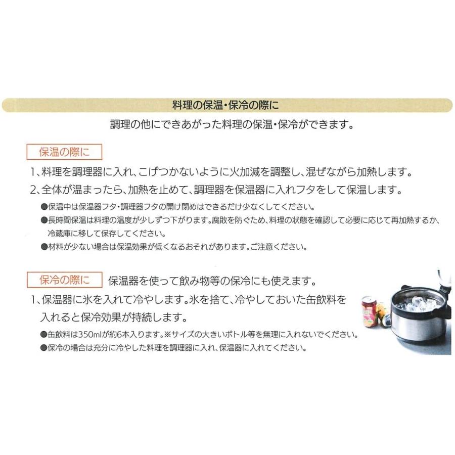 - サイズ:調理器=口径17.5cm 幅20×奥行20×高さ14cm 保温器=口径20.5cm 幅25.5×奥行24.5×高さ20cm