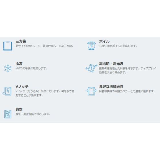 彊美人 XS-2633 Vノッチ付 ◇温度帯を選ばず誰でも簡単に使えます。◇サイズも豊富で使いやすい彊美人シリーズ。◇「彊美人70,80,90」豊富な3タイプの厚さで全178種類からお選びいただけます。◇美しい光沢感、優れた透明性、しなやかな柔軟性、製法由来の内面衛生性を持った製品です。◇-40℃冷凍から100℃30分ボイルまで一枚で対応し、独自技術の低カールは自動給袋適性良好です。◇使用例(70μ):ハム、ざる豆腐、明太子、ソーセージ、うどん、漬け物、カット野菜、豚角煮、生?、魚の切り身、イカめし、ソース、キムチ、クリームチーズ、ちくわ、厚焼き玉子、はんぺん、あさり、佃煮、こんにゃく、サバ味噌煮。※100枚入外袋にはJTIN(JAN)コードを印刷しています。※ハイバリア品ではないため、脱酸素剤は使えません。※レトルト包装用途にはご利用いただけません。●サイズ(厚(μ)×幅(mm)×長(mm):70×260×330●入数:1000枚