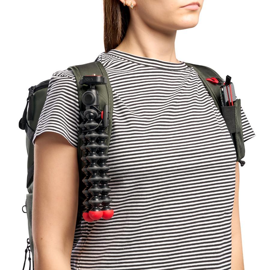 レンズを装着したままのカメラと2本の交換レンズを収納可能なカメラコンパートメントは取り外しが可能で、普段使いのバックパックとしても利用することができます。また、14インチまでのノートパソコンに対応したスリーブも、取り外して単独で使用することができます。一方、スマートフォンや小物類の収納に便利な別売のクロスボディポーチをバッグの両サイドに取り付けて、収納力をアップグレードすることも可能です。