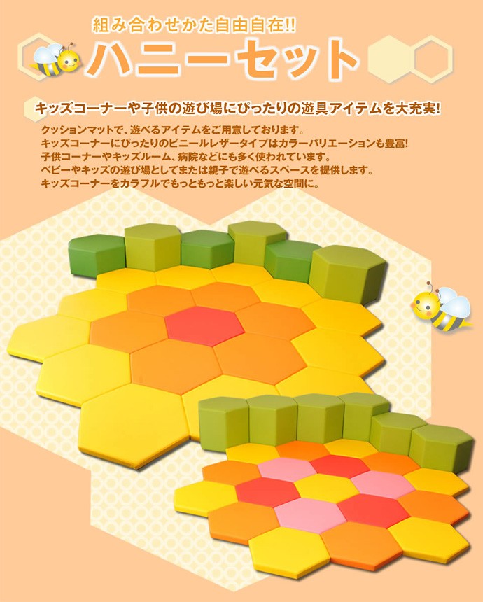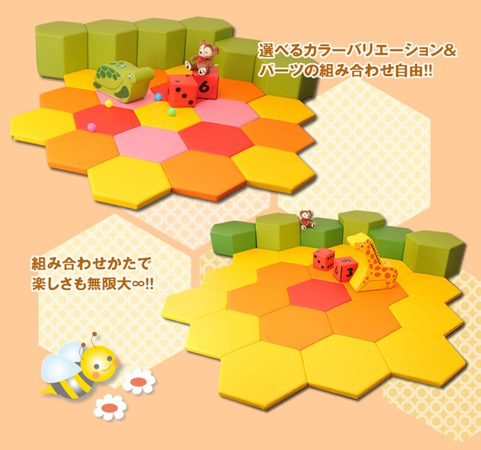 まるでミツバチの巣のような六角形のかわいいキッズコーナーセットです。座り心地のよい弾力性のある子ども用のスツール(いす)です。張り地カラーも豊富にご用意しました。(区分)キッズコーナー キッズスペース キッズルーム 日本製 かわいい 待合室 カーディーラー 子供 遊び場 保育園 幼稚園 病院 クリニック 室内 スツール いす チェアー 椅子 子供用 送料無料"}