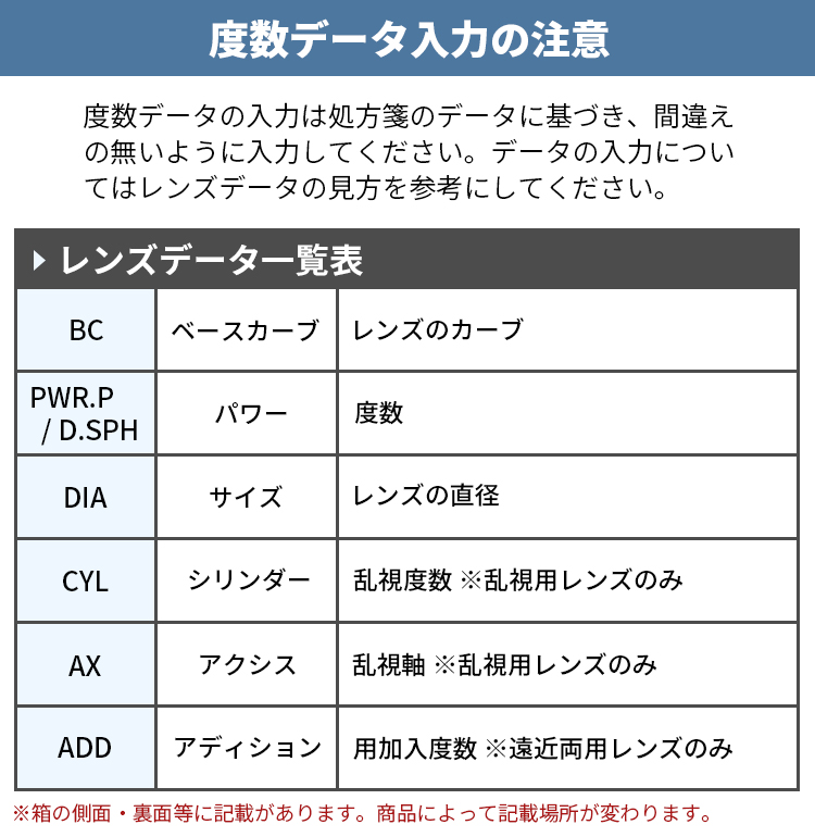 | 片眼のみご購入の際も、左右同じ内容をご選択いただければ片眼用としてご使用いただけます。 コンタクトレンズには「右眼用」「左眼用」の区別はございませんので、ご安心ください。 |