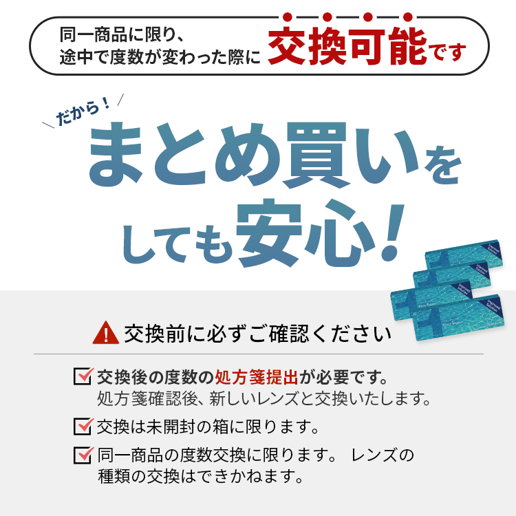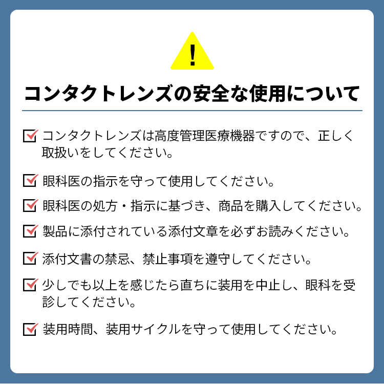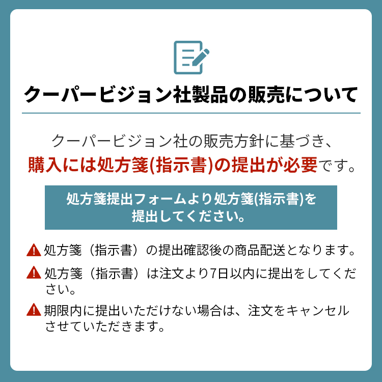 | ・クーパービジョン社の商品を購入の際は処方箋が必要です。 ・コンタクトレンズは、必ず眼科医を受診し、眼科医の指示(処方)に従ってご購入ください。受診されていない場合は、コンタクトレンズをご購入いただけません。 ・コンタクトレンズの不十分な洗浄・消毒など不適切なケアや、長時間または交換期間を超えた装用により重篤な眼障害の発生の危険性がありますので、必ず眼科医の指示に基づき、ご使用ください。 ・ご使用の際には、必ず添付文書の内容、特に「警告」「禁忌・禁止」「特にご注意いただきたいこと」「使用上の注意」を確認し、使用方法を遵守してください。 ・必ず3か月毎に眼科医による定期検査を受けてください。また、少しでも異常を感じたら直ちに眼科医の検査を受けてください。 |