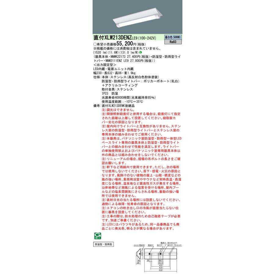 【法人様限定】パナソニック XLW213DENZ LE9 LEDベースライト 防湿型・防雨型 直付型 20形 Dスタイル FL20×2灯相当