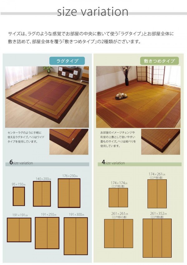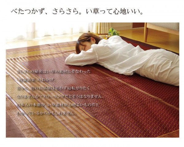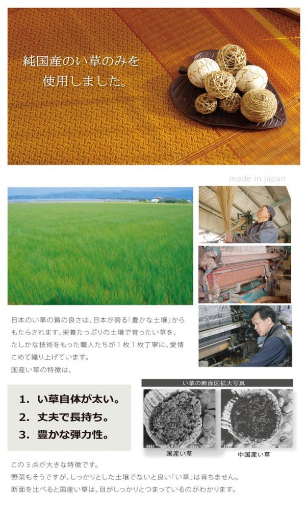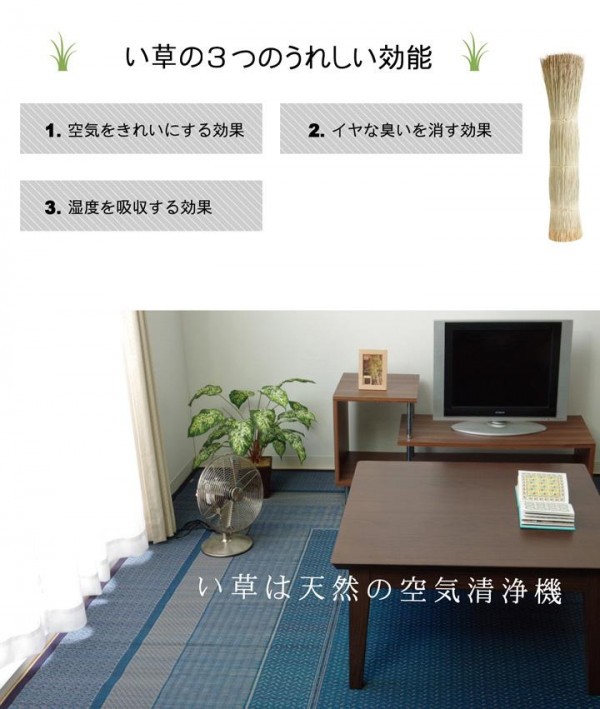 ■い草には空気の自然浄化作用、湿度の調節作用などがあります。また汚れにくく、使用するうちに黄金色に変化し味が出ます。