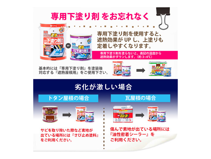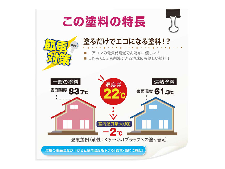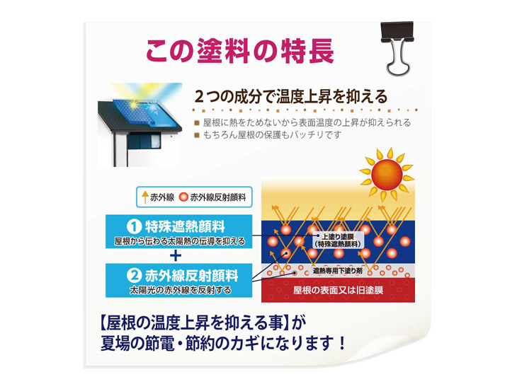 特殊遮熱顔料と赤外線反射顔料が赤外線を反射し、同じ色の従来塗料と比較して屋根の表面温度の上昇を抑えます。
