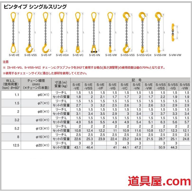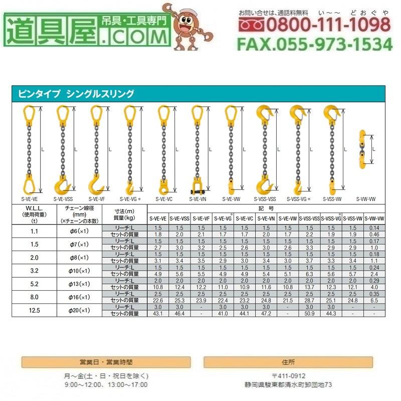 ■【メーカー】:(株)キトー■【型番】:SVEVE8■【仕様】●一本吊りセット品●使用チェーンの線径(太さ):8mm●全長L:1.5m●使用荷重:2.0ton●セットの質量:3.1kg■【納期】:通常翌日〜4日発送