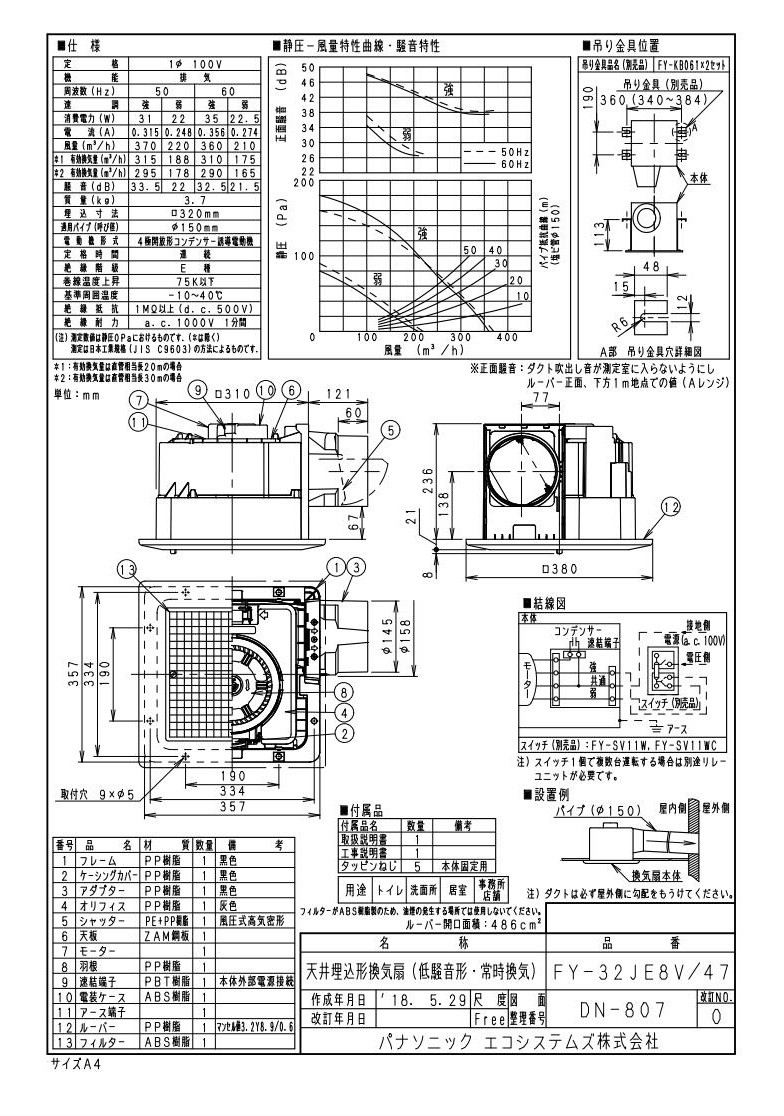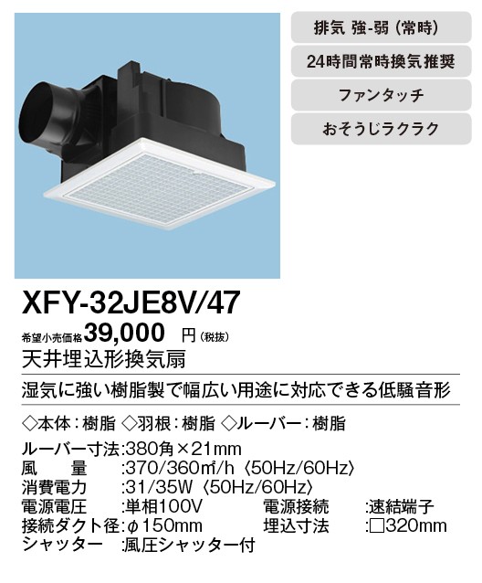 換気扇 パナソニック ダクト用換気扇 FY-32JE8V-47 検索用カテゴリ255 【埋込320角】 【パイプ150】 【低騒音】XFY-32JE8V/47 Panasonic 天井埋込形換気扇 ルーバー組合せ品番(フィルター付 ホワイト) 強・弱速調付 トイレ・洗面所、居室・事務所・店舗用 低騒音形 310立方m/hタイプ