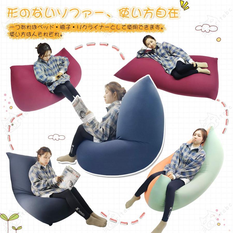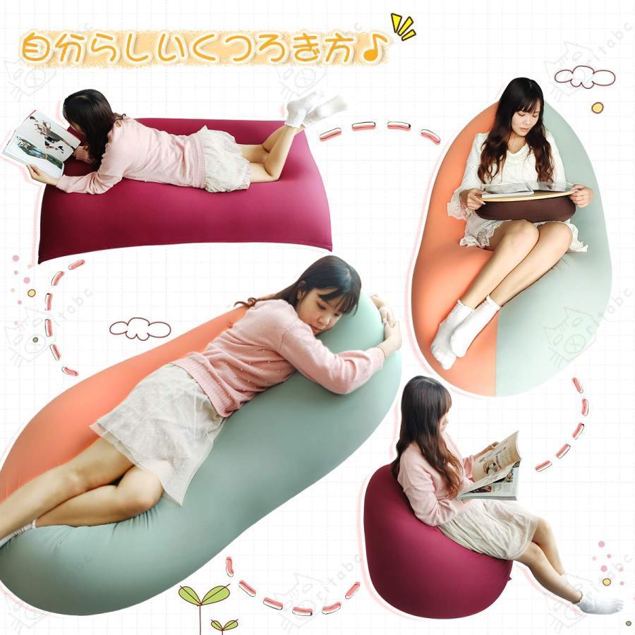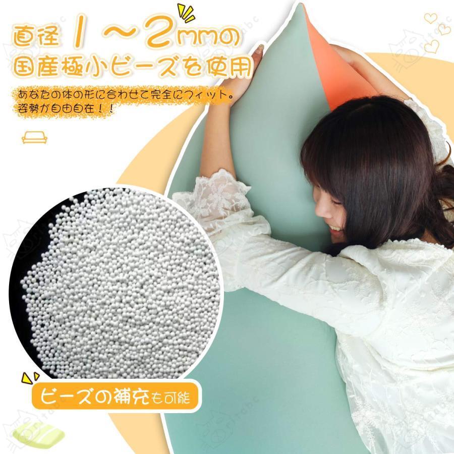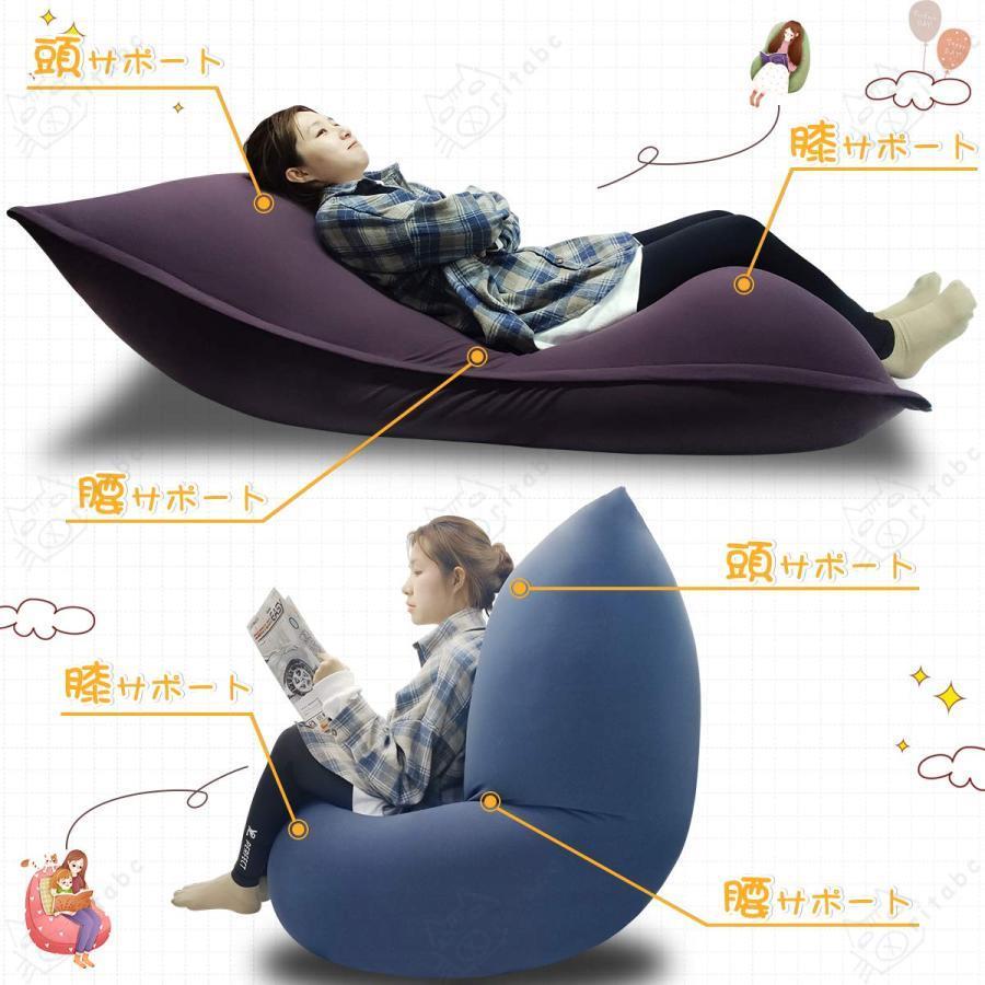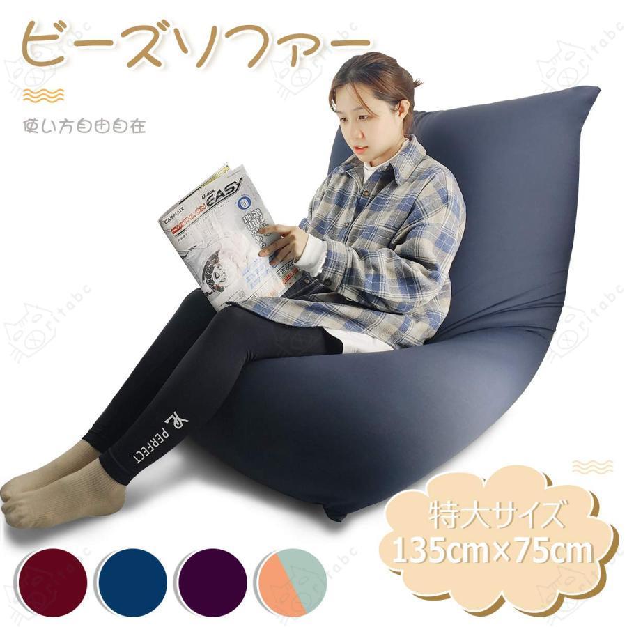 【特大サイズ】135cm×75cmの幅広いサイズで、一人でも二人でもご利用頂けます。イス・リクライナー・ベッドとして使えるので、読書・仕事・ゴロ寝など様々なシーンで大活躍しています。【置き方&座り方自在】使い方は人それぞれなので、お好きな姿勢に合わせてクッションを平置き・縦置き・横置きにして使えます。お部屋に一つあれば自由なライフスタイルを演出します。【国産極小ビーズ使用】直径1?2mmのビーズを使用。体の動きによってビーズが流動し、クッションが変形して体にフィットしてくれます。深く座ったり、寝転んたり、どんな座り方でも対応でき、身も心も癒され、疲労を解消することができます。※ビーズの補充も可能です。【カバー取外し可能】毎日座るビーズクッションだから、カバーは取り外して洗える設計です。カバーのファスナーは大きく開けられますので、カバーの脱着も簡単!!カバーは通気性&吸水性に優れているコットン90%を使用しています。【軽量&持ち運びやすい】わずか6.5kgなので、女性でも無理なく片手で持ち上げられます。部屋の掃除をする時などラクラク移動させることができます