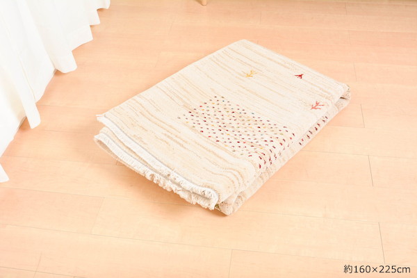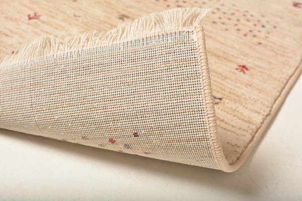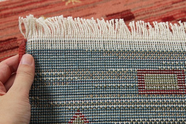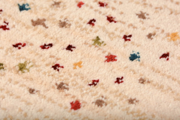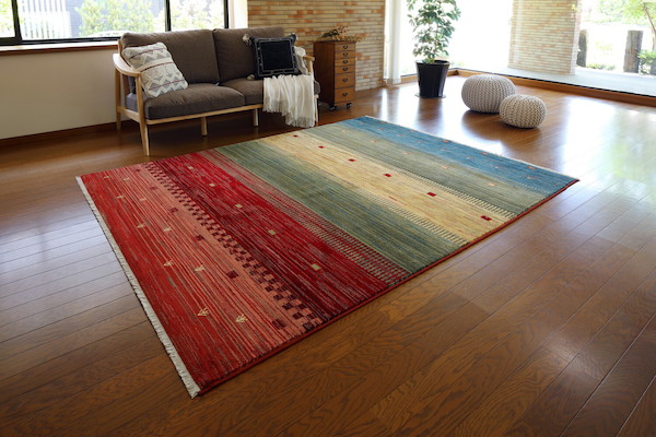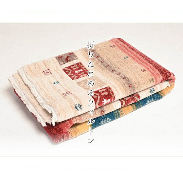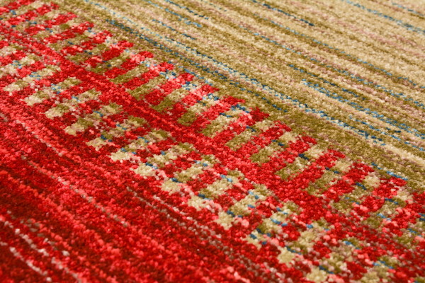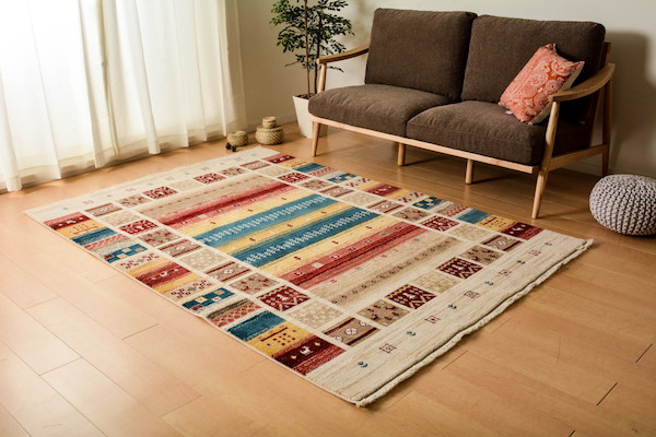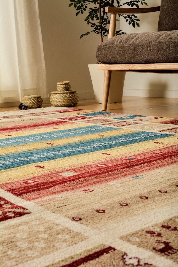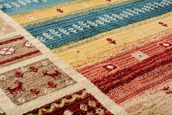 民族調手織り絨毯ギャッベの様なエスニックなデザインをウィルトン織機で織りあげました。