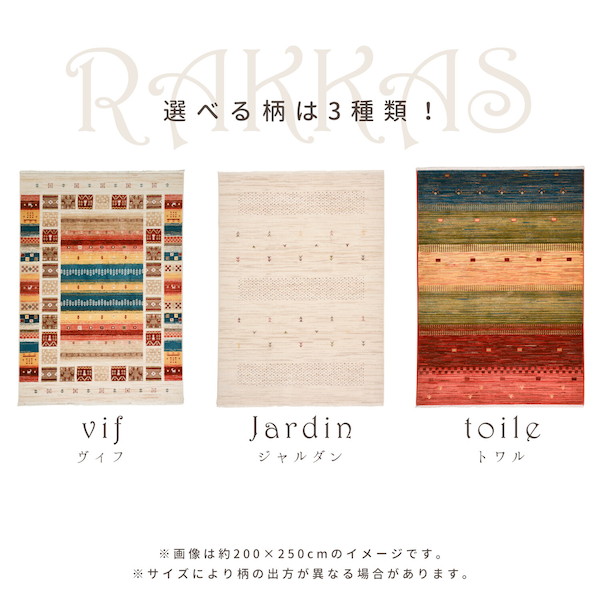 ウィルトン織ラグ トルコ製 「RAKKASラッカス」 約140X200cmラグの名産地トルコ製の1枚。毛足は、1cm程ありますが、密度が高いので、掃除機もかけやすいようデザインされています。遊び毛が少なく、お手入れがしやすい素材です。ホットカーペット・床暖房対応です。縦糸の特殊加工により折りたたんで収納可能です。耐久性に優れているウィルトン織なので、長く使いたい方におすすめです。 ■種類:ヴィフ/トワル/ジャルダン■サイズ:約140X200cm■生産地:トルコ■素材・成分:表面:ポリプロピレン100% パイル長:約10mm・123,000ノット・商品は、モニターによって色合いが異なって見える場合があります。・イメージ画像は、約200X250cmを使用しています。■送料:全国一律900円※北海道・沖縄・離島へのお届けは別途送料が必要になりますので、事前にお問い合わせください。240619910 240619920 240619900 ラグ カーペット トルコ ウィルトン ウィルトン織 お洒落 上品 オールシーズン ホットカーペット 床暖対応 エスニック"}