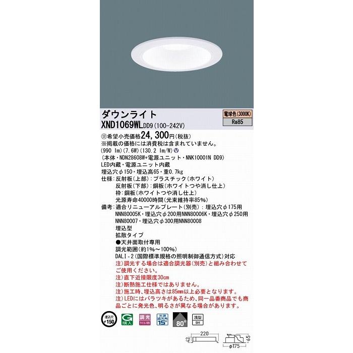 ■返品区分:「返品」お客様都合による返品・交換は受付いたしません。仕様等はご注文前に必ずご確認ください。※画像はイメージです。商品の詳しい仕様はメーカー受付窓口/HPにてご確認ください。※掲載商品は予告無く販売終了となっている場合もあり、掲載商品全ての出荷確約をするものではありません。ライト・照明器具 天井照明 ダウンライト LED ダウンライト 施設用照明器具パナソニック XND1069WLDD9 LED 電球色 調光 DALI-2対応 NDN28608W + NNK10001NDD9和風照明器具 おしゃれ 和室 照明 インテリア 新築 リフォーム 20221128 家具、インテリア 照明器具 天井照明、シーリングライト ダウンライトXND1069WLDD9 商品説明