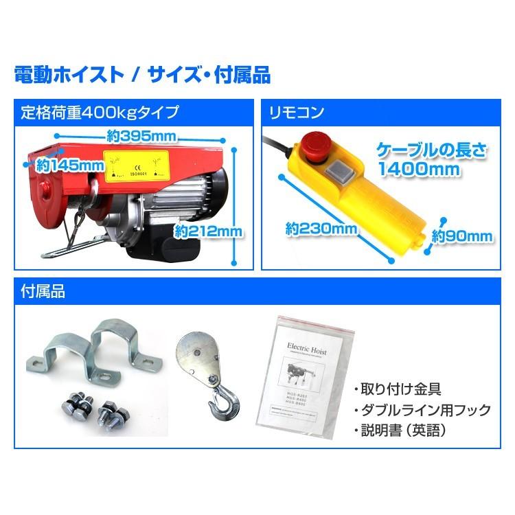 [送料無料]さまざまの物を吊り上げたり、作業にも使えます。リモコンでラクラク操作!安心!!リモコンには緊急停止ボタンが付いています♪家庭用電源(100V)なので、工場に限らずご家庭でもご使用頂けます。【商品仕様】◆シングルフック最大吊揚荷重:200kgリフト高さ:12mリフト速さ:10m/min◆ダブルフック最大吊揚荷重:400kgリフト高さ:6mリフト速さ:5m/minケーブル長さ(約):12mケーブル太さ(約):3.8mm電源:100V(50/60Hz)モーターパフォーマンス:980W本体サイズ(約):395x212x145mmリモコンコード長さ(約):1.4m本体重量(約):17kg当店では クリスマス バレンタイン ホワイトデー 母の日 父の日 敬老の日 こどもの日 お正月 福袋 誕生日 お祝い 等の プレゼント にも おすすめ の商品も ご用意。その他 不織布マスク DIY アウトドア ガーデニング キャンプ 用品 便利グッズ が人気!