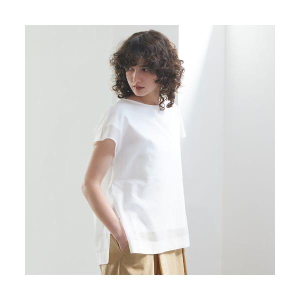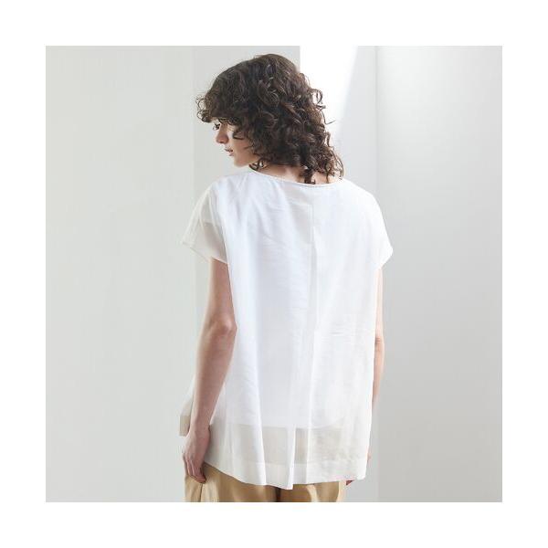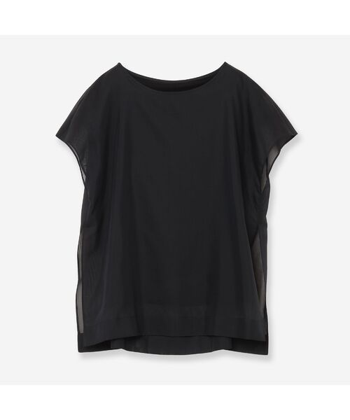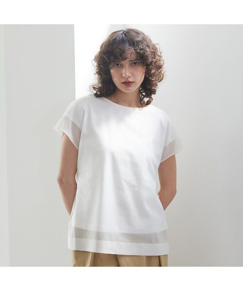 フレンチスリーブのTシャツにシアーオーガンジーを重ねて表情を出したプルオーバー。さり気ない大人の肌見せを叶える素材がアクセントとなって映え感もアップ。両サイドのスリット、背中心には大きくBOXタックを入れて動きのある立体的なデザインにしています。