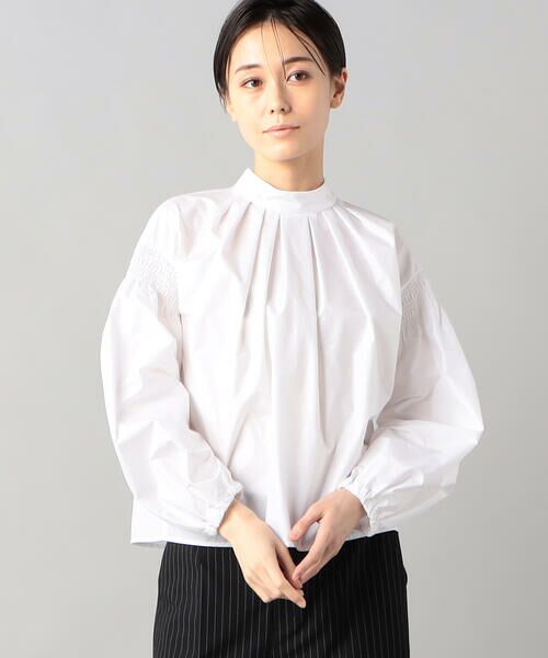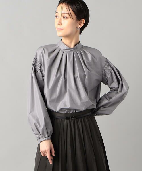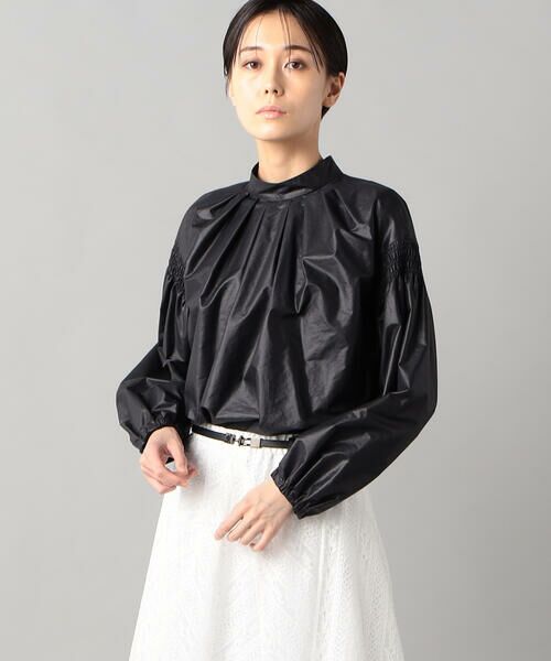 タックとシャーリングのボリュームを、軽やかな素材でエアリーに仕上げた、シャイニングタイプライター タックブラウスです。