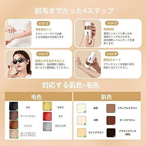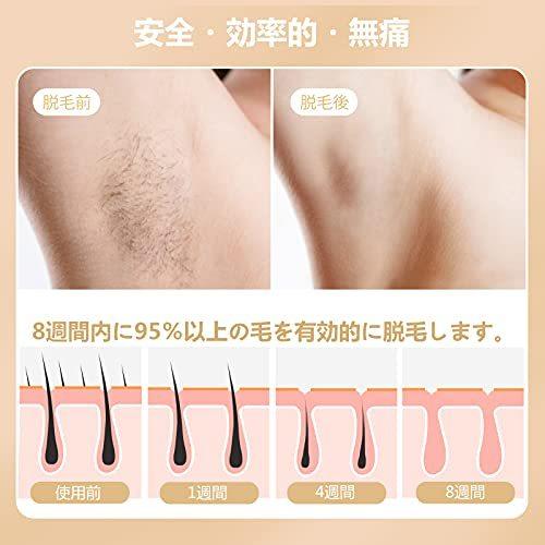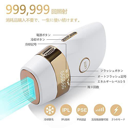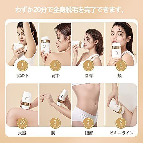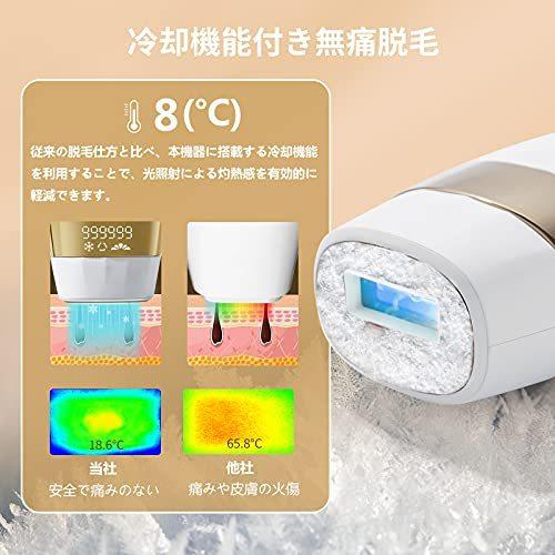 【冷感脱毛・痛くない】この脱毛器は最新の非侵入性IPL脱毛技術を採用し、毛根までに働きかけ、毛根を弱らせて自然に脱落して、肌にダメージを与えず脱毛できます。冷却機能が付き、動作時に肌表面の温度を下げて、使用後の高温や乾燥による痛みを避けて、痛くない快適な脱毛を体験させます。【99万照射回数・5段階調節可能】99万回の照射回数で、一人なら全身永久脱毛分に相当します。男女兼用で家族と共用いただけます。5段階の照射強度が調整可能で、使用者の肌の色や毛髪色、お肌の調子に合わせて適当な段階を選べます。初めてのご利用は、必ずレベル1からお使いください。【2つのモード・全身脱毛可能】光脱毛器は手動モードと自動連続モードを搭載しています。自動モードは背中・足・腕や腿などの大面積に適します。手動モードは脇やビキニライン、細かい部位などの小面積に適用します。顔はもちろん、手足、脇、背、ビキニ、口角周りなど、ほぼ全身脱毛が可能です。【冷感脱毛・痛くない】この脱毛器は最新の非侵入性IPL脱毛技術を採用し、毛根までに働きかけ、毛根を弱らせて自然に脱落して、肌にダメージを与えず脱毛できます。冷却機能が付き、動作時に肌表面の温度を下げて、使用後の高温や乾燥による痛みを避けて、痛くない快適な脱毛を体験させます。