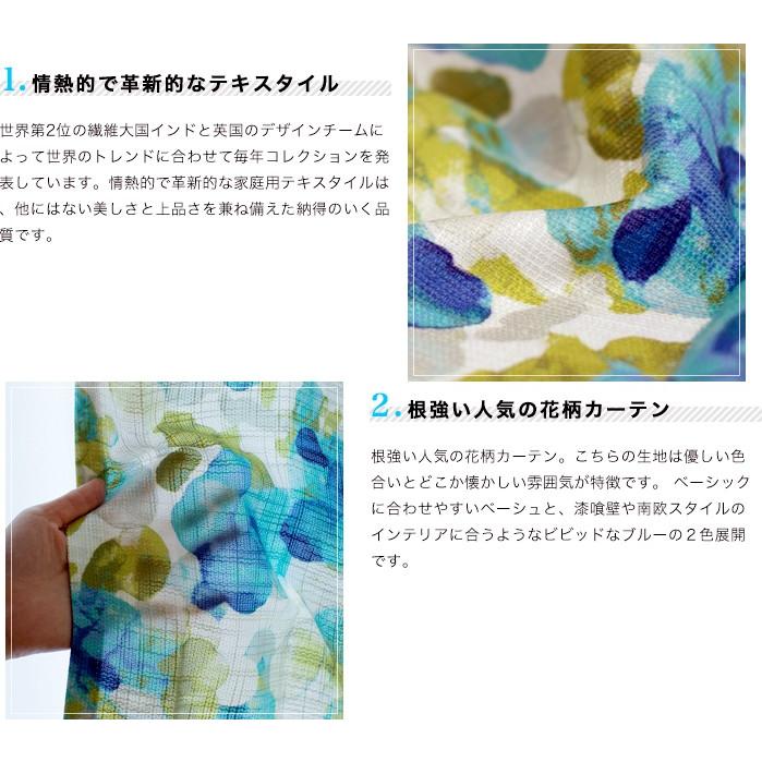 - 根強い人気の花柄カーテン。こちらの生地は優しい色合いとどこか懐かしい雰囲気が特徴です。ベーシックに合わせやすいベーシュと、漆喰壁や南欧スタイルのインテリアに合うようなビビッドなブルーの2色展開です。