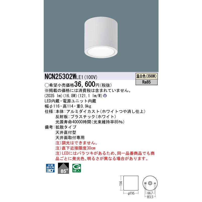 [法人限定] NCN25302W LE1 パナソニックスポットライト 天井直付 温白色 小型シーリングライト ビーム角85度 拡散 光源遮光角30度 [ NCN25302WLE1 ]