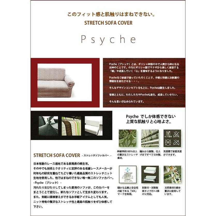 【内容】psyche(プシュケ)とは、ギリシャ神話の中で人間から神になる女神のことです。のちにギリシャ語で、サナギから美しく変容する「蝶」や、変化していく「心」を意味するようになりました。純国内生産にこだわり、本物のクオリティを追求したソファカバーです。ポリエステル素材がほとんどの従来人のソファカバーに対して、コットン比率を大幅にアップすることで抜群の肌触りと吸湿性を実現しました。またいつでも快適にご愛用していただけるようにも施してあります。高いストレッチ性で多くのソファにぴったりとフィットします。お手持ちのソファの汚れ防止はもちろん、時期に合わせたドレスアップとしても、是非ご活用ください。新開発素材を採用しています。収縮率180%の贅沢なストレッチ素材を使用。綿を76%配合した極上の肌触りと抜群の吸湿性で熱のこもりやすいウレタンや化繊、合成皮革等のソファに最適です。●素材綿76% ポリエステル17% ポリウレタン7%●機能(SEKマーク取得)・ウォッシャブル<対応ソファサイズ>肘無3人掛け用)巾140cm〜200cm/高さ〜90cm/奥行80cm〜90cm