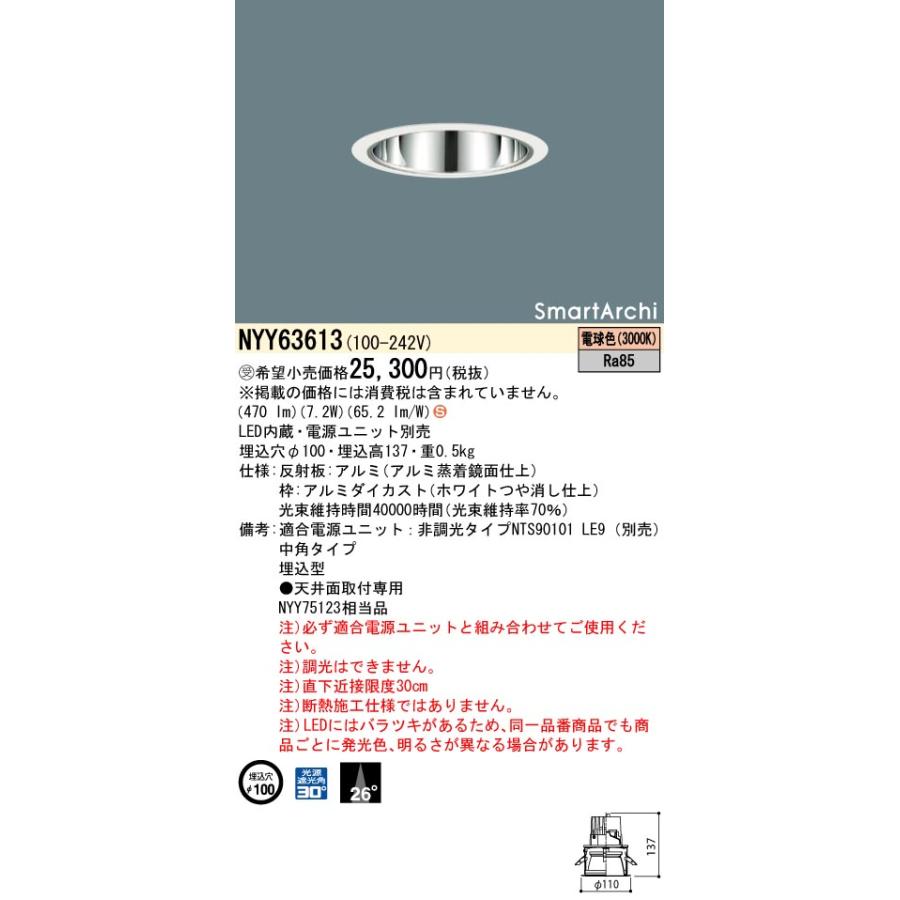 パナソニック NYY63613 ダウンライト 埋込穴φ100 電源ユニット別売 LED(電球色) 天井埋込型 中角26度 SmartArchi ホワイト 受注品 [§]