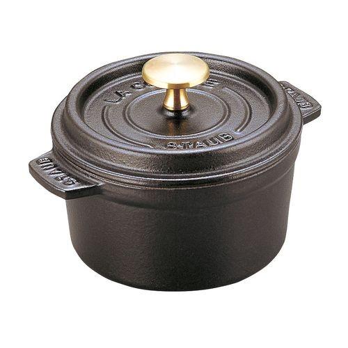 ストウブ ピコ・ココット ラウンド 14cm 黒40509-476 RST3403 JANコード 3272341014252●サイズ表示(cm):14●内径×深さ(mm):135× 80●容量(cc):750●重量(kg):1.6●底径(mm):106●底板厚(mm):10●材質:鋳鉄■staub~ストウブ~ 【フランス製】 鋳鉄製であらゆる熱源に対応します。■※シーズニング(慣らし)不要です。■※IH対応三ツ星シェフが大絶賛 ストウブ社の製品は独自の黒マットエマイユ加工により、 さらに使いやすさがアップします。■従来のホーロー加工とは 異なり、ザラザラ感を出しています。■油が馴染みやすく 焦げ付きません。■しかも、使用方法やお手入れ方法は簡単 で、食物の酸にも負けません。■また、厚みのある鋳鉄は熱を均一に伝えます。■熱が逃げにくく、風味やビタミンも逃しません。■《セルフ・ベイスティング・システム》 加熱した材料から出た蒸気は、蓋の内側のスパイク(突起) から、均一に滴となって戻ってきます。■そのため、旨味を逃さない無水料理が可能です。■・内側、外側共に黒マットエマイユ加工