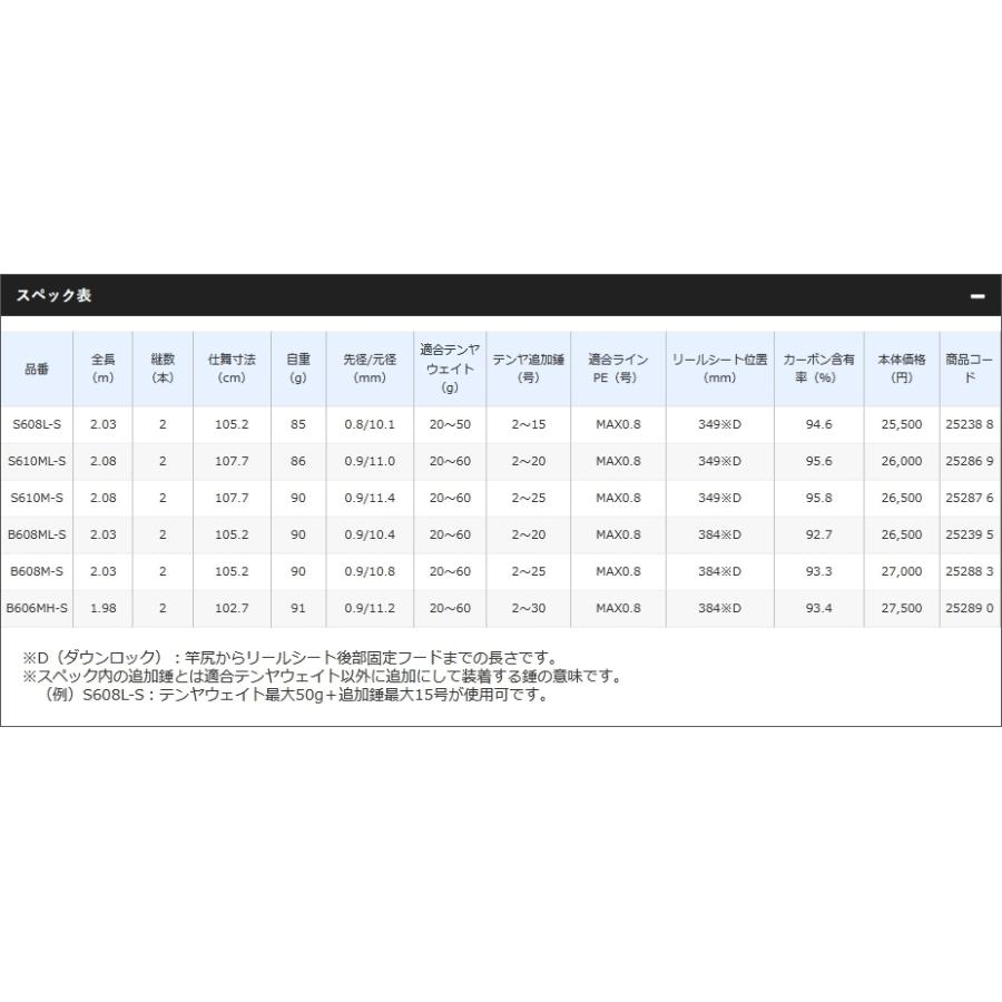 メーカー : シマノ SHIMANO商品名 : サーベルマスター SS スティック SABER MASTER SS stick S610MS種類 : ルアーロッド スピニング用主な用途 : オフショアライトジギング・タチウオ 青物・太刀魚等硬さ : M (ミディアム)■全長(m):2.08■継数(本):2■仕舞寸法(cm):107.7■自重(g):90■先径/元径(mm):0.9/11.4■適合テンヤウェイト(g) : 20〜60■テンヤ追加錘(号) : 2〜25■適合ラインPE(号):MAX0.8 ■リールシート位置 (mm) : 349※D※D(ダウンロック):竿尻からリールシート後部固定フードまでの長さです。■カーボン含有率(%) : 95.8 ■商品コード : 25287 6[S610M-S]汎用性が高いMLパワーをベースに、より重い仕掛けへの対応力と操作性を向上させたMパワーモデル。喰い込み性能と操作性を両立させたアイテムです。送料サイズ:140JAN : 4969363252876ハイパワーX
