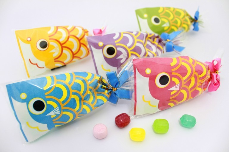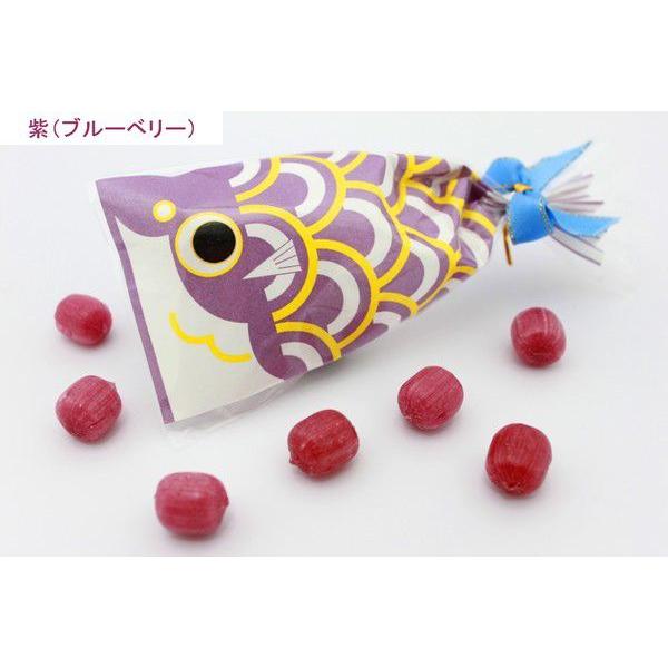 ポップでカラフルな鯉のぼりキャンディーは、青(サイダー)・赤(苺ミルク)・黄(レモン)・緑(メロン)・紫(ブルーベリー)の5種類!