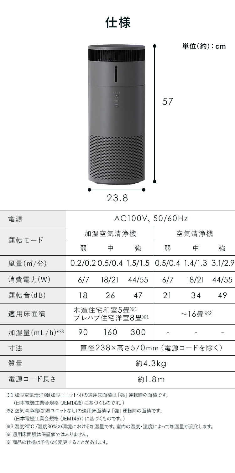 ※1 加湿空気清浄機(加湿ユニット付)の適用床面積は「強」運転時の面積です。(日本電機工業会規格(JEM1426)に基づくものです。)