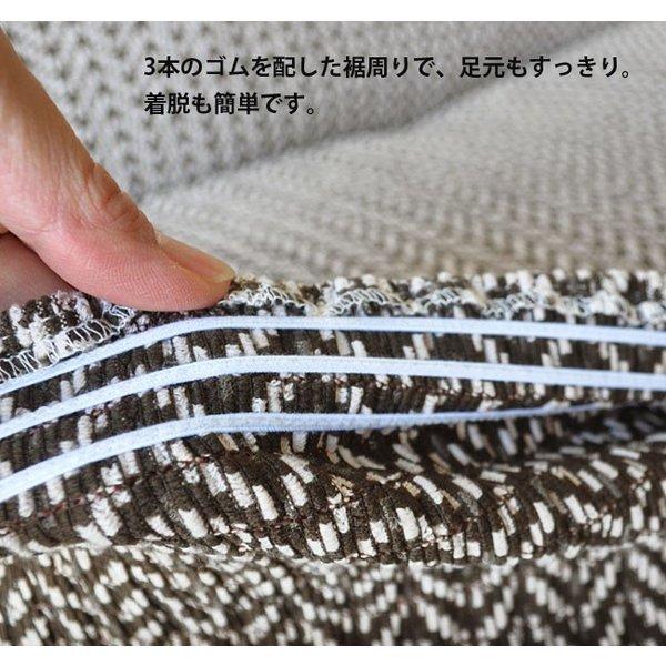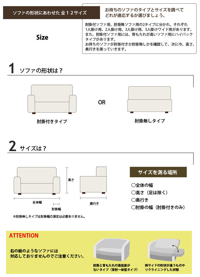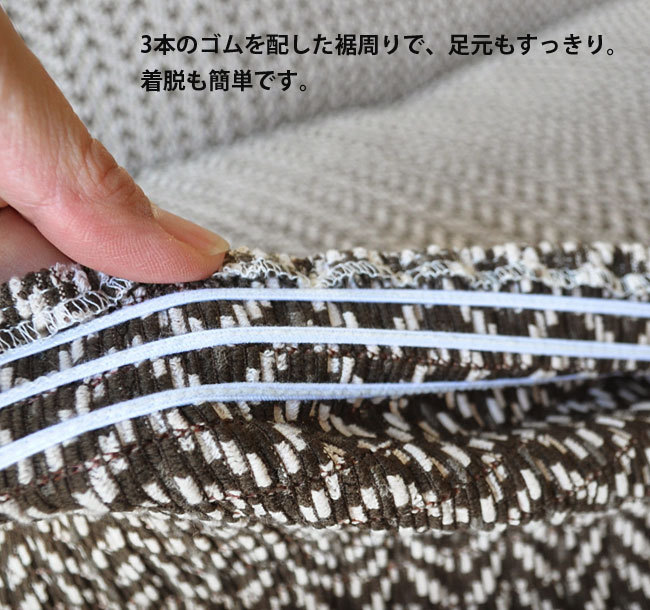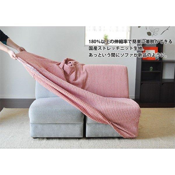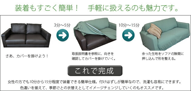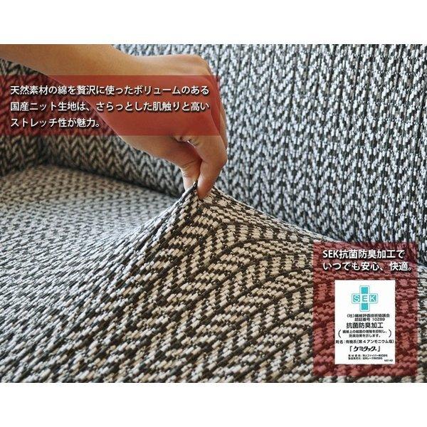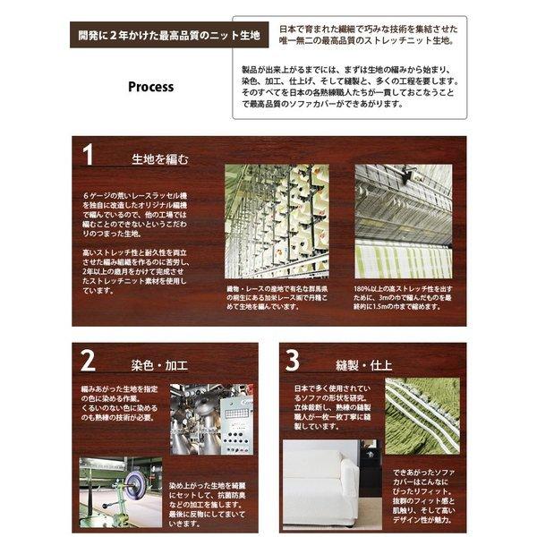 【国産の最高品質ニット生地】 日本の老舗レースメーカーが独自の技術で編み上げた伸縮性の高いストレッチニット生地を使用。 天然素材の綿を贅沢に使った生地は、さらっとした肌触りと抜群の吸湿性があり、もちろんオールシーズンでご使用できます。 ソファーへのフィット力も非常に高く、着脱もとても簡単です。 【縫製・仕上げ】 綺麗にフィットするように考えられた、熟練職人による丁寧な縫製。 生地から縫製、仕上げ、包装まですべて国内で生産した最高品質の国産ソファカバーです。 また、裾部分全体にゴムをあしらってあるので、より綺麗にソファーにフィットし、本来のソファの形を崩さないよう工夫されています。 | ![]() |