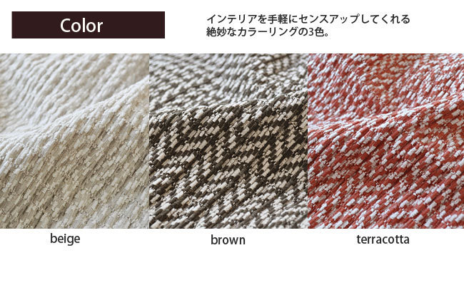 ◆ サ イ ズ ◆ 肘掛無しソファー用【3サイズ展開】 ○1人掛けソファー用 ○2人掛けソファー用 ○3人掛けソファー用 ◆ カラー展開 ◆ ○ベージュ ○ブラウン ○テラコッタ ◆取り扱い方法◆ 洗濯絵表示に従って洗濯してください。 ![]() ◆ 素 材 ◆ ポリエステル56%/綿38%/ポリウレタン4%/リネン2% ◆ 機 能 ◆ ○抗菌防臭加工 ○ウォッシャブル ◆ 生 産 国 ◆ 日本 Made in Japan | ![]() |