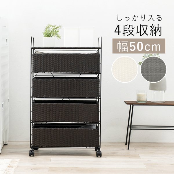 ランドリーラック おしゃれ バスケット かご カゴ 4段 キャスター付き ランドリー収納 白 ラタン調 収納 洗面所 脱衣所 省スペース 幅50 ほぼ完成品 ID005