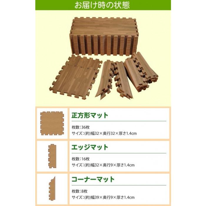 リトルプリンセス 抗菌加工 フロアーマット(ジョイントマット) 195cm×195cm(約2畳分) 木目調ブラウンウッド インテリアにもしっくり馴染むシンプルな色使いのフロアーマットです。場所に合わせて自由に組み合せが可能。しっかりとした厚みで衝撃を吸収しやすく、床の傷防止や防音にも役立ちます。また、ハイハイ時のお子様のひざの保護などに役立ちます。 生産国:台湾 素材・材質:EVA樹脂 商品サイズ:正方形マット:約W32×D32×H1.4cm、エッジマット:約W32×D9×H1.4cm、コーナーマット約W32×D9×H1.4cm セット内容:正方形マット×36枚、エッジマット×16枚、コーナーマット×8枚 しっかりとした厚みのプレイマットです。 キーワード【家具 インテリア カーペット ラグ マット】