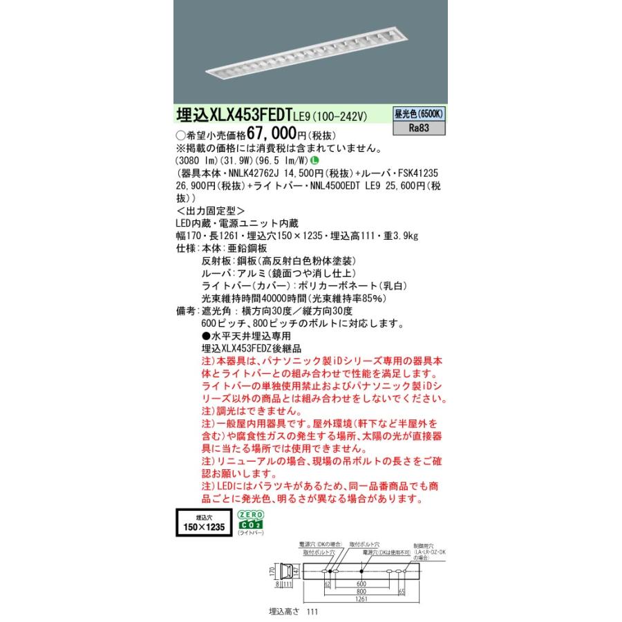 天井埋込型 40形 一体型LEDベースライト アルミルーバ フリーコンフォート Hf蛍光灯32形定格出力型2灯器具相当/Hf蛍光灯63形定格出力型1灯器具相当 Hf32形定格出力型/Hf63形定格出力型・5200 lm【器具本体】NNLK42762J 【プラスユニット】FSK41235【ライトバー】NNL4500EDT LE9 LED内蔵、電源ユニット内蔵※旧型番 XLX453FEDZ LE9(XLX453FEDZLE9)の後継品光源◆LED(昼光色) ◆色温度:6500 K ◆光源寿命40000時間(光束維持率85%)寸法・質量◆幅:170 mm ◆長:1261 mm ◆埋込穴幅:150 mm ◆埋込穴長:1235 mm ◆埋込高:111 mm ◆質量:3.9 kg仕様・注意事項◆器具光束:3080 lm ◆安定器出力型:定格出力型 ◆安定器補足:<出力固定型> ◆電圧:100〜242 V ◆消費電力:31.9 W ◆消費効率:96.5 lm/W◆グレア分類:V3◆【本体】亜鉛鋼板◆【反射板】鋼板(高反射白色粉体塗装)◆【ルーバ】アルミ(鏡面つや消し仕上)◆【ライトバー(カバー)】ポリカーボネート(乳白)◆天井埋込型◆Ra83◆遮光角:横方向30度/縦方向30度◆600ピッチ、800ピッチのボルトに対応します。◆●水平天井埋込専用◆注)調光はできません。