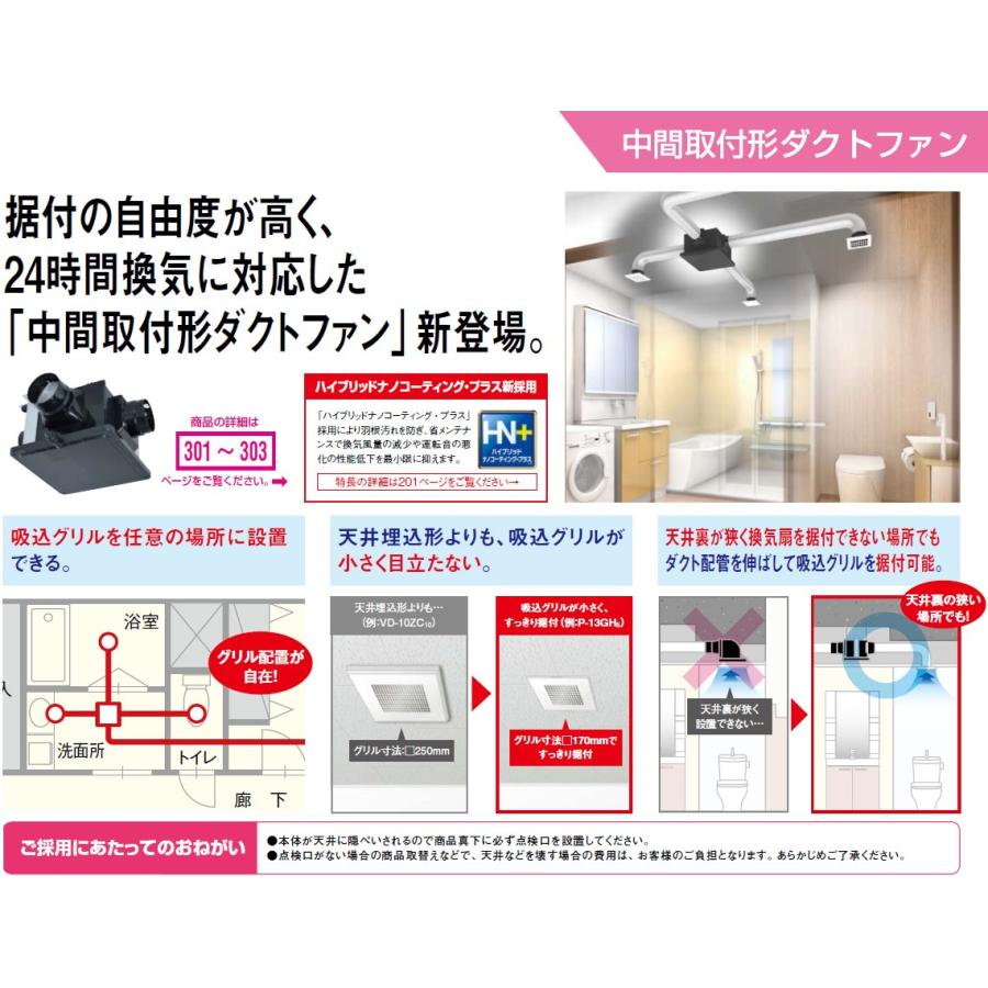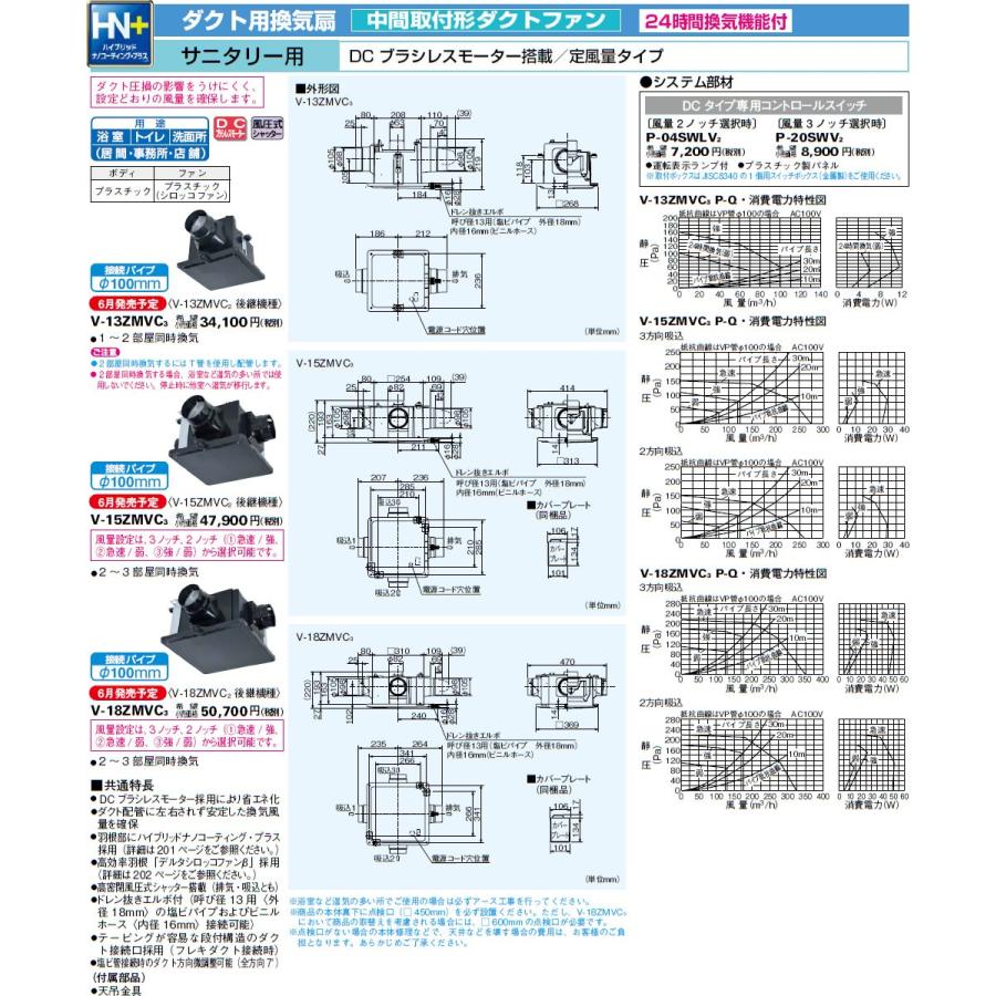 【交換可能な旧品番】V-13ZMVC2、V-1ZMVCハイブリッドナノコーティング・プラス採用で、羽根汚れを10年ガード!●高密閉風圧式シャッター搭載●24時間換気機能付●ACモーター搭載タイプと比べて消費電力を大幅低減●汚れがつきにくいハイブリッドナノコーティングプラス採用主な機能・仕様・DCブラシレスモーター採用により省エネ化・ダクト配管に左右されず安定した換気風量を確保・羽根部にハイブリッドナノコーティング・プラス採用・高効率羽根「デルタシロッコファンβ」採用・高密閉風圧式シャッター搭載(排気・吸込とも)・ドレン抜きエルボ付(呼び径13用〈外径18mm〉の塩ビパイプおよびビニルホース〈内径16mm〉接続可能)・テーピングが容易な段付構造のダクト接続口採用(フレキダクト接続時)・塩ビ管接続時のダクト方向微調整可能(全方向7°)・1〜2部屋同時換気・付属部品:天吊金具ご不在時の商品配達のご連絡のため、番号はなるべく携帯の番号を入力してください。
